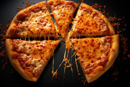 Top view of hot pizza cheese ,Tasty pizza cheese on black background.