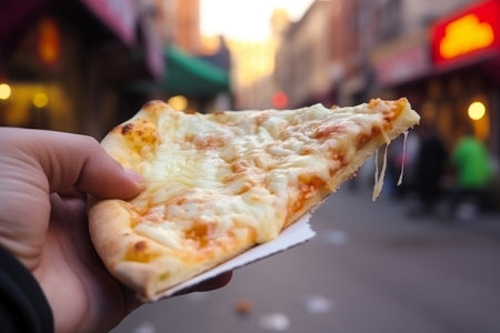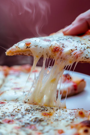 Female hand tearing off appetizing hot slice of pizza with cheese closeup