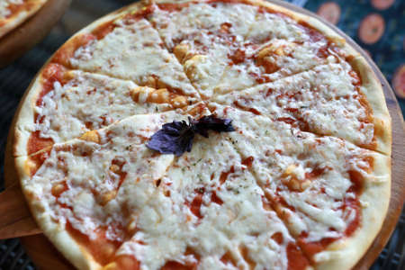 Delicious pizza Margarita in a traditional Italian pizzeria. Selective focus.