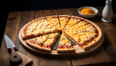 Delicious Thin Crust Cheese Pizza Cut Into Eight Slices on a Wooden Table, A delectable thin crust cheese pizza featuring eight neatly cut slices served on a rich wooden table background.
