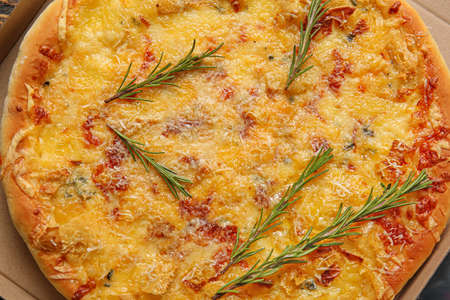 Tasty pizza in cardboard box, closeup