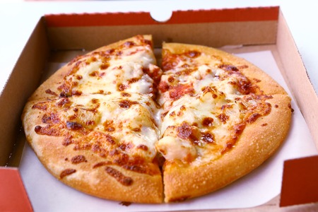 Pizza in cardboard box close up photo