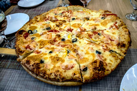 Pizza with seafood. Mozzarella, tuna and shrimps.