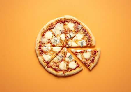 Sliced cheese pizza on an orange background above view. Pizza sliced in eight. Delicious homemade pizza top view. Pizza made only with cheese and tomato sauce.