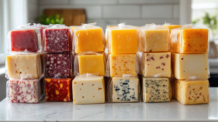 Multiple plastic packs of cheese cubes, each with different label designs, displayed on a modern kitchen island