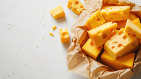 An assortment of cheese cuts is arranged on a white background, showcasing diverse cheeses Perfect for culinary or food-related projects.