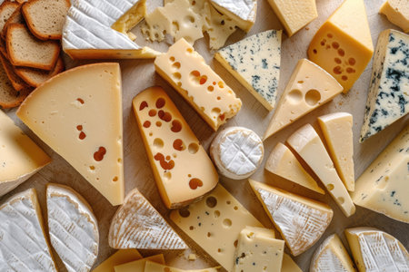 An overhead view of a selectable assortment of cheeses, creating an appetizing backdrop