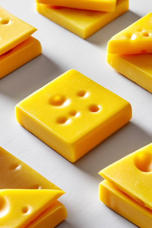 Cheese sheets are arranged neatly in a minimalist style on white surface, creating a clean and organized look. Concept of food photography, culinary arts, gourmet packaging.