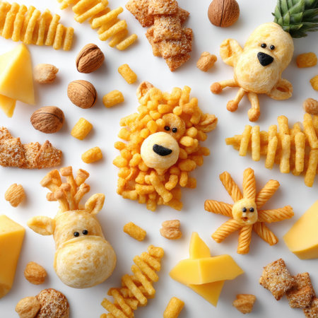 A playful display of various snack foods including cheese, crispy treats, and whimsical shapes, perfect for a festive occasion or a casual gathering.