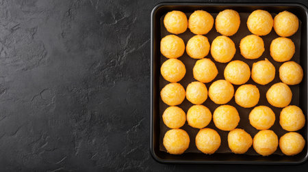 A batch of baked cheese puffs piled on a serving tray with space above for copy