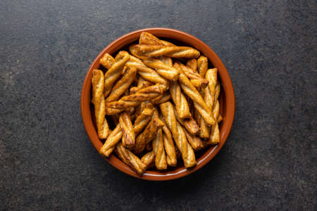 Salted pretzel sticks. Salted crackers in a bowl. Top view.