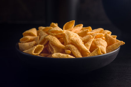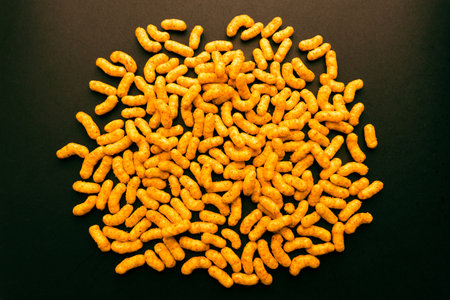 Round composition of peanut puff snacks on dark surface, crunchy golden texture ideal for food photography, advertising, and creative commercial projects