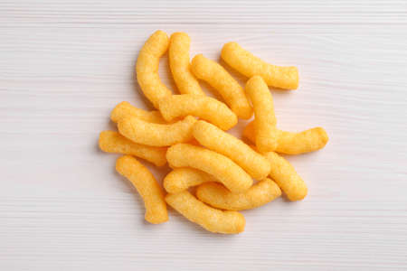 Heap of tasty cheesy corn puffs on white wooden table, flat lay