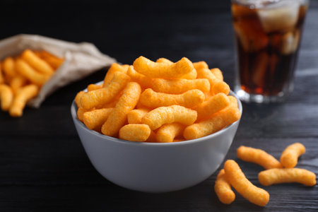 Bowl with crunchy cheesy corn snack on black wooden table, closeup