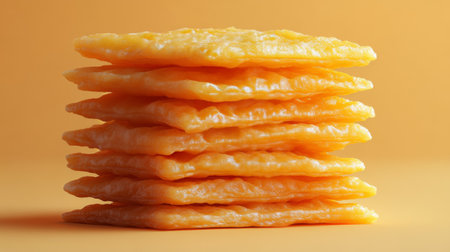 Editorial close-up shot of thick slices of sharp cheddar cheese perfectly stacked, situated beside a