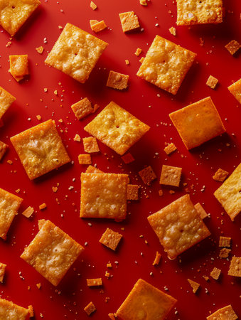 Delicious Crispy Cheese Crackers Scattered on a Vibrant Red Background, Ideal for Snack Advertisements AI Generative