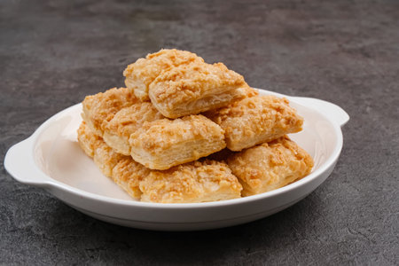 Puff pastry squares arranged in a minimalist style on a clean surface. Light golden crust highlights flaky texture, creating appealing visual. Concept of baking, culinary art, pastry shops.