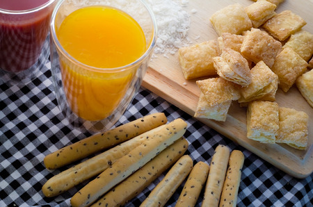 crispy pie on the wooden table with orange juice focus on crispy pie on the right