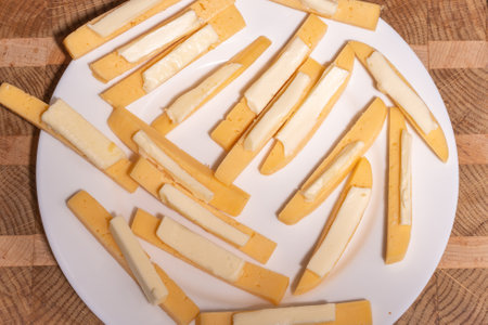 Captivating arrangement of golden cheese sticks and crumbles scattered on a dark surface, ideal for culinary presentations, food recipes, and gourmet photography.