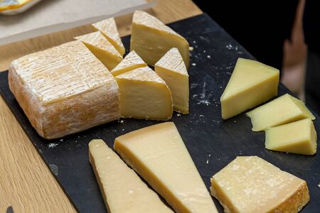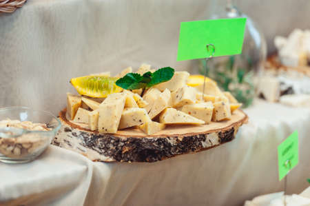 Hard goat cheese on the table. Many varieties of craft cheese are on the counter during the cheese festival. Dairy product sales concept