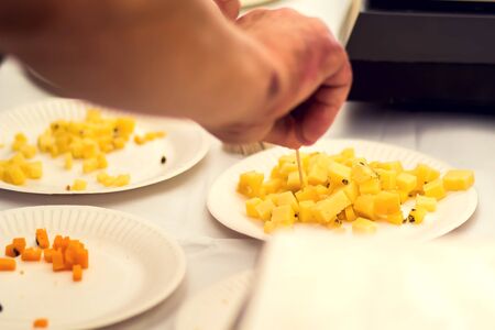 Tasting of different hard cheeses in Italian cheese farm shop, tasting cubes on board