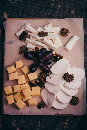 a plate with cheese and walnuts. four types of cheese on the board. Close-up.