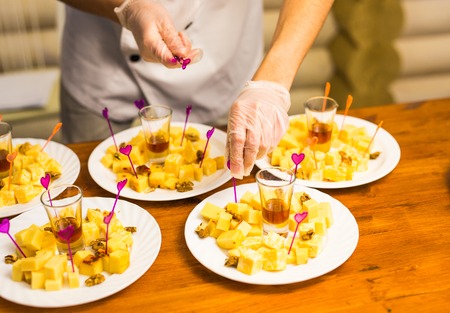 Various types of cheese on Hotel restaurant table. Buffet catering service with Cheese variety - Brie, Emmental, White Goat cheese and jedal cheese, close-up.