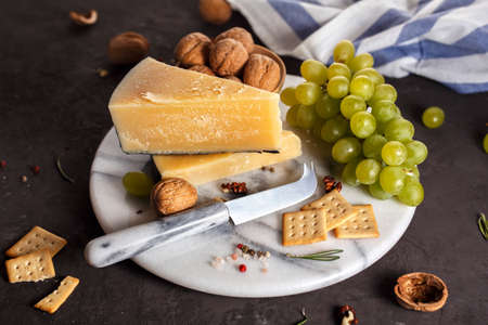 Different kinds of cheese served with grape and honey for gourmet nutrition. Organic parmesan and hard cheese set delicatessen