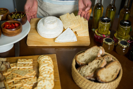 Close-up of staff arranging piece of cheese on wooden board in grocery shop