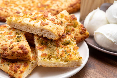 Tasty italian vegetarian food, fresh baked flat foccachia bread with white mozzarella cheese and herbs close up