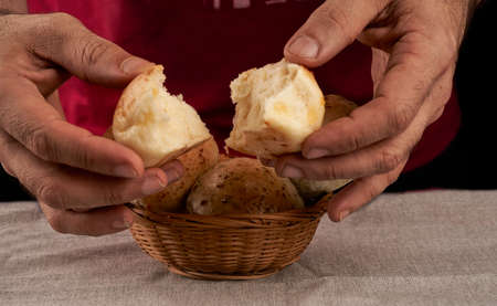 man's hand breaking piece of flavored bread