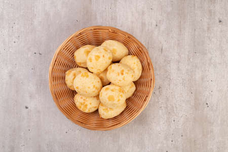 Typical brazilian cheese buns in a basket, top view.
