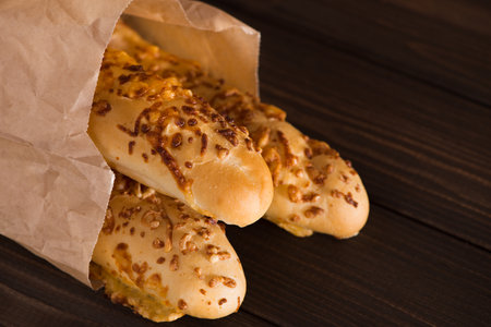 Fragrant Italian bread with baked cheese on a wooden dark background. Close-up. Free space on the right