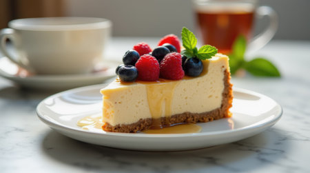 A slice of creamy cheesecake garnished with raspberries, blueberries, and a drizzle of honey is served on a marble table alongside a cup of hot tea. The atmosphere is warm and inviting.