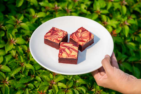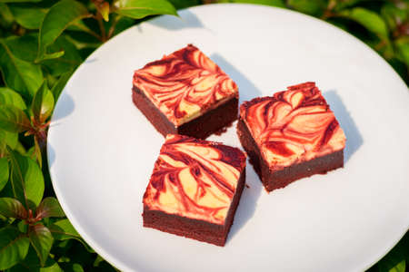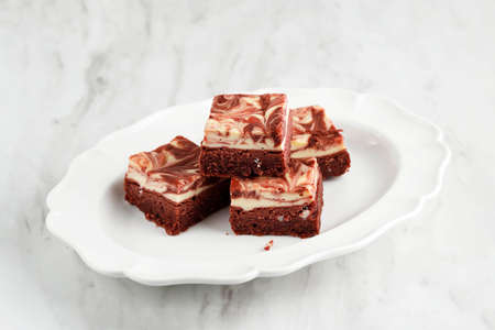 Red Velvet Cream Cheese Brownies on White Ceramic Plate, Isolated