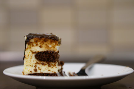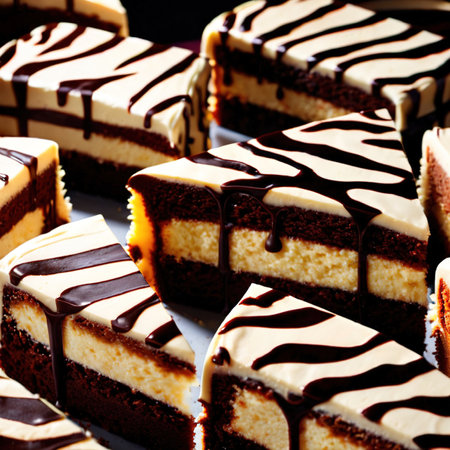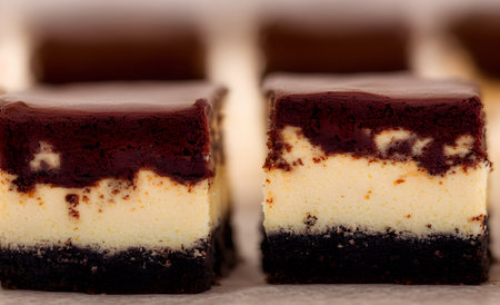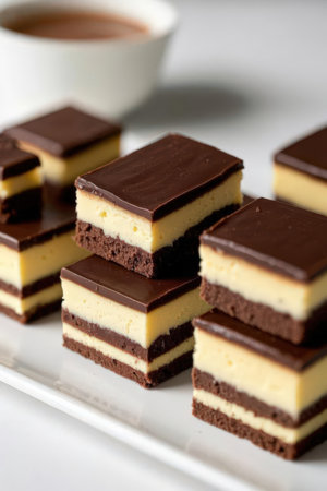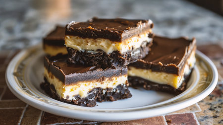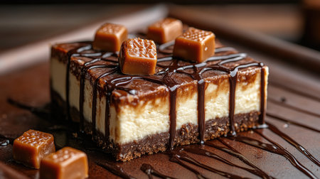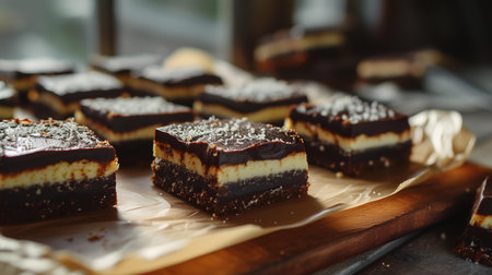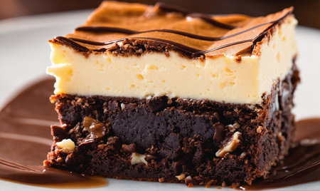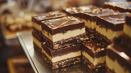 A tempting display of rich layered dessert featuring a creamy filling and smooth chocolate topping, perfect for snack lovers and dessert enthusiasts.