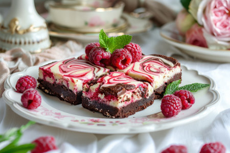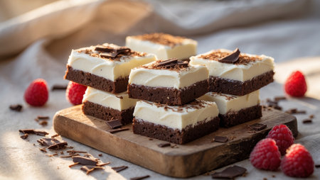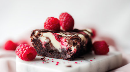 A close-up shot presents a brownie dessert topped with fresh red raspberries. The dessert exhibits a layered structure with dark chocolate and creamy white filling. The composition features a shallow depth of field, with soft lighting and a blurred background. Suitable for culinary, food, or lifestyle publications.