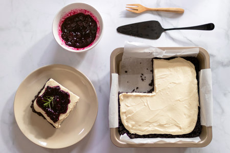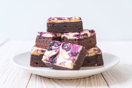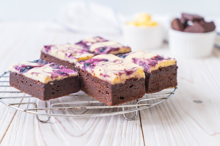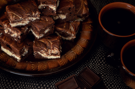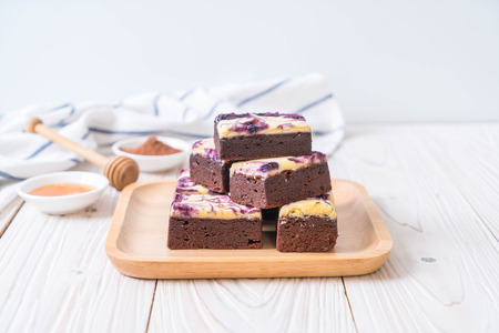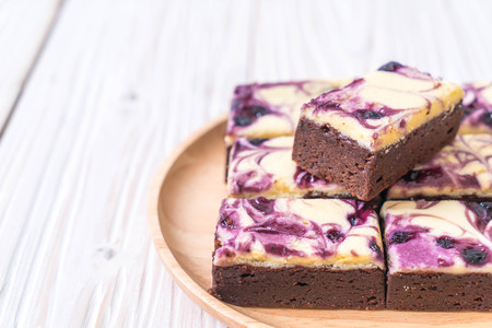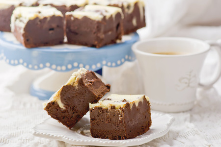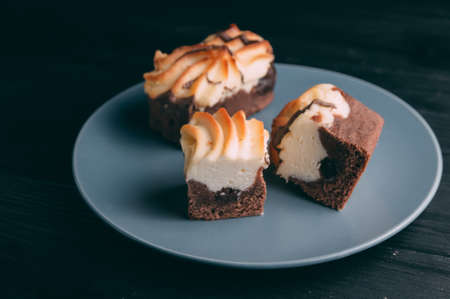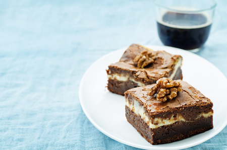 brownie with cream cheese on a light blue background. tinting. selective focus