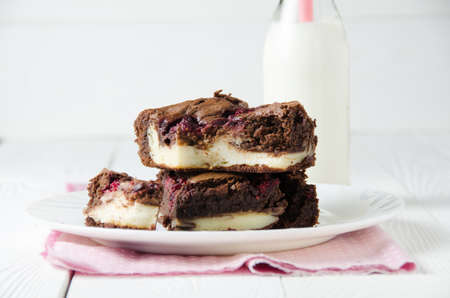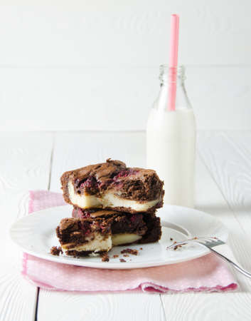 Raspberry brownie stuffed with cheesecake on pink napkin, bottle of milk and cotton flower. White wooden background