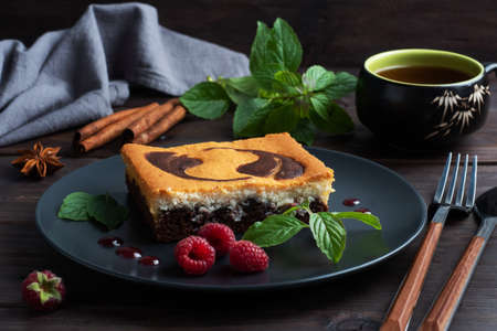 A piece of double-layer cake on a plate of chocolate brownies and curd cheesecake with raspberries Dark background copy space