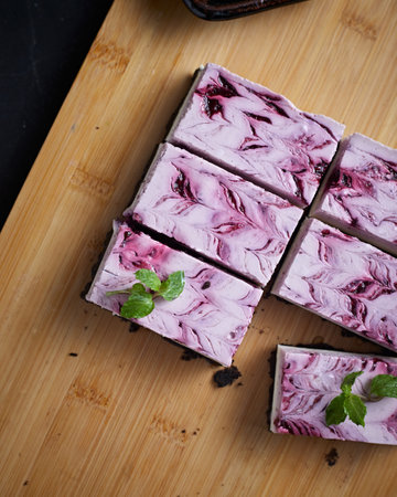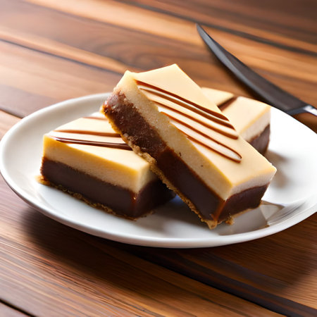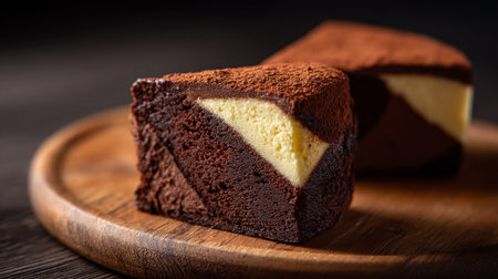 three squares of chocolate brownie and cookie, resembling cheese, are showcased in this photo. the colors range from light red to dark amber, creating an explosive pigmentation. the dessert appears to have multilayered dimensions, with streaked patterns and clean-lined edges. this unique creation exudes a distinct manapunk aesthetic. ai generated
