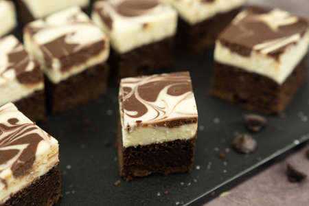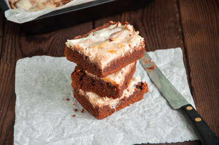 Stack of brownie cheesecake squares on a parchment paper on a wooden background. Close up.