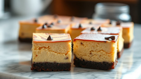 Chocolate chip cheesecake squares displayed on a marble countertop, perfect for dessert lovers or special occasions