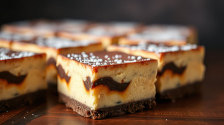 Delicious layered chocolate cheesecake squares on a wooden table with powdered sugar garnish ready to serve at a gathering