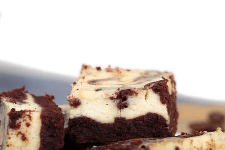 Still life with a slice of cheesecake brownie. The background is white. Close-up.