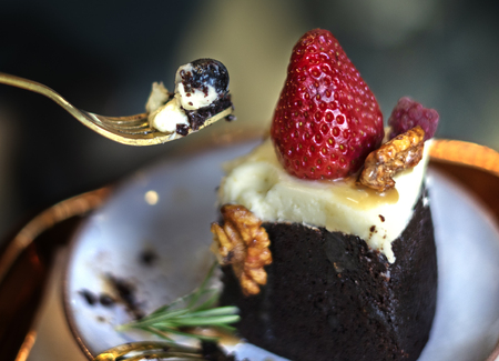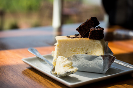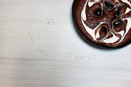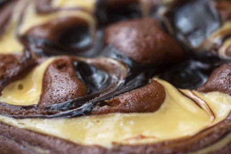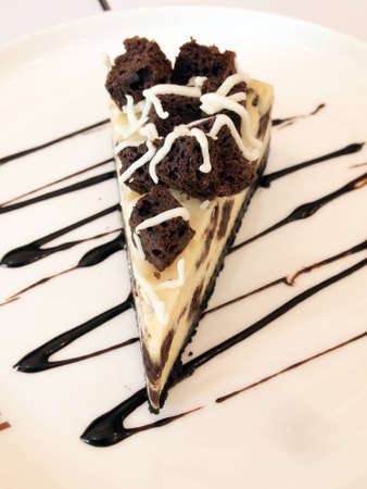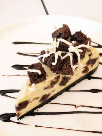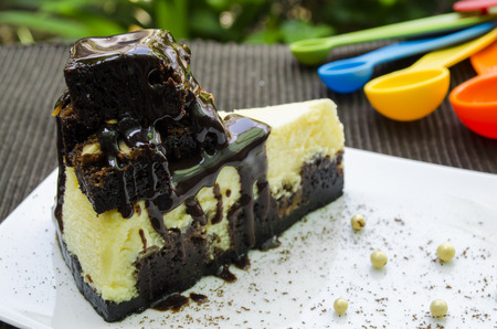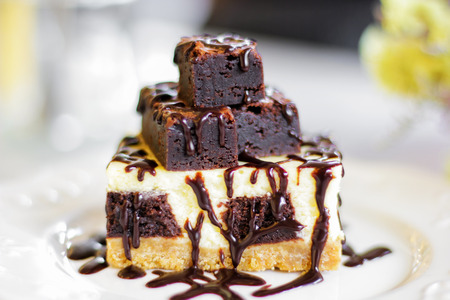Homemade chocolate cheesecake topping brownie and dark chocolate sauce