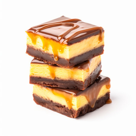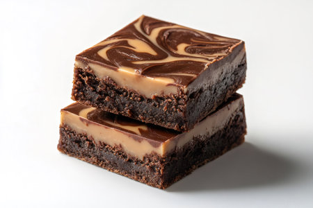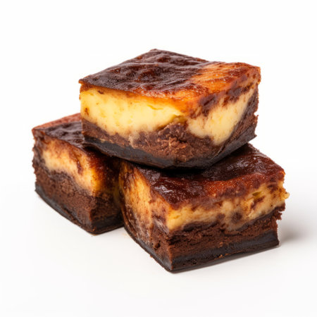 rich brownies, topped with a velvety custard pie, sit elegantly on a pristine white background, showcasing their decadent texture and vibrant colors in this high-resolution 8k real photo, perfect for food bloggers, chefs, and dessert enthusiasts seeking mouthwatering visuals. ai generated