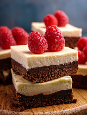Decadent chocolate cheesecake bars topped with fresh raspberries on a wooden platter, perfect for a gourmet dessert treat.