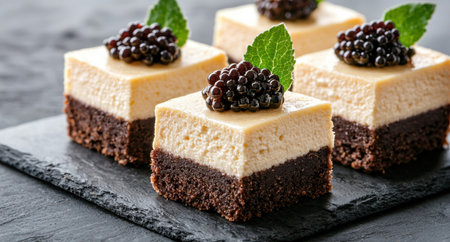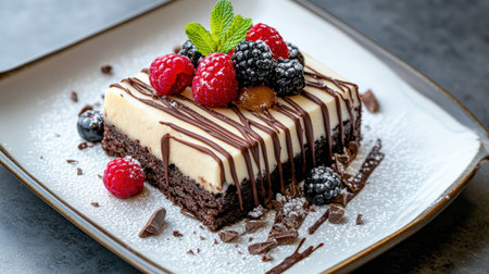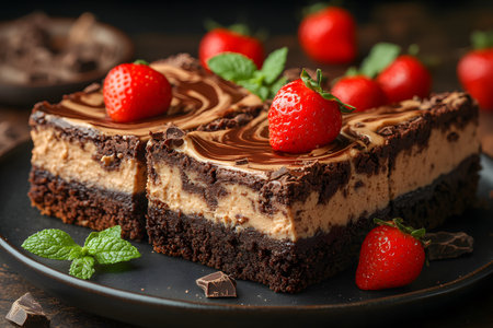 Indulge in the rich layers of chocolate cheesecake brownies, artistically topped with fresh strawberries and garnished with mint. perfect for gourmet dessert presentations and celebrating sweet moments. Generative AI