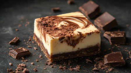 A slice of chocolate swirl cheesecake on a dark surface with chocolate shavings